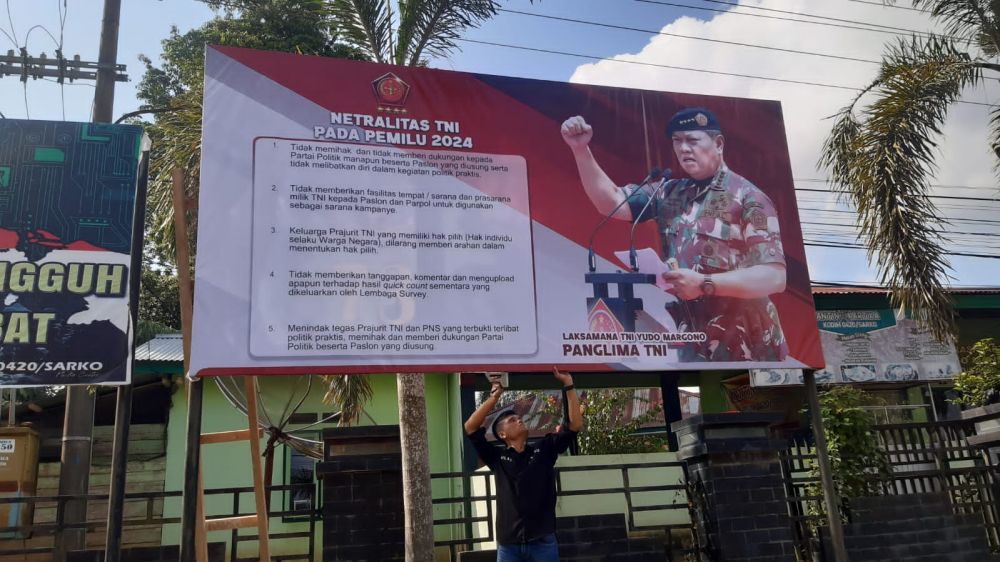 Mangacu pada surat edaran Puspen TNI agar satuan jajaran untuk memasang spanduk/baliho Panglima TNI Laksamana TNI Yudo Margono tentang himbauan dan penekanan kepada prajurit TNI untuk netral tidak berpihak dan tidak ikut serta politik praktis pada pelaksanaan pemilu serentak nantinya.