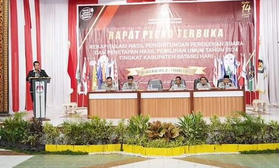MUARABULIAN - Komisi Pemilihan Umum (KPU) Kabupaten Batanghari melaksanakan Rapat Pleno Terbuka Rekapitulasi Hasil Pemilihan Umum Tahun 2024 tingkat Kabupaten Batanghari, Sabtu (2/3/2024) di gedung Pemuda Muarabulian, Kabupaten Batanghari.