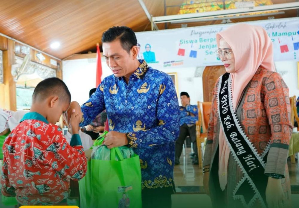 MUARABULIAN - Bupati Batang Hari, Muhammad Fadhil Arief, SE bersama Ketua TP PKK Batang Hari, Zulva Fadhil menyerahkan bantuan pakaian seragam sekolah kepada siswa/siswi berprestasi dan kurang mampu jenjang TK, SD dan SMP se-Kabupaten Batang Hari Tahun Anggaran 2025 di serambi rumah dinas Bupati Batang Hari, Rabu (17/9/2025).