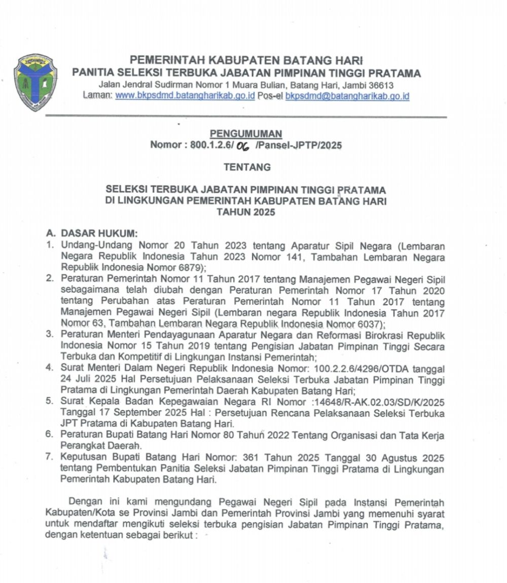 MUARABULIAN - Pemerintah Kabupaten Batang Hari membuka pelaksanaan seleksi Jabatan Pimpinan Tinggi (JPT) Pratama tahun 2025.