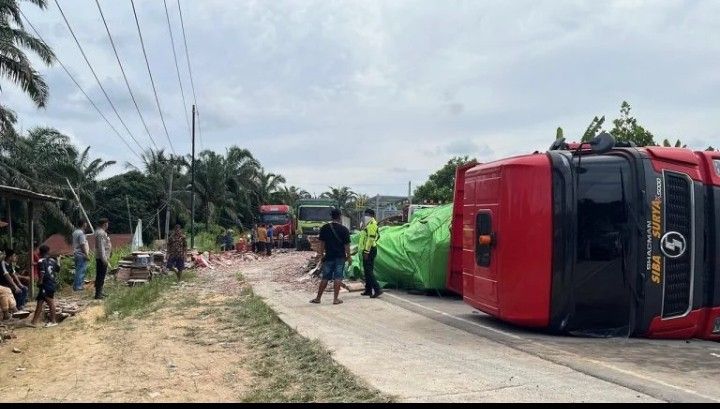 TANJAB BARAT Kecelakaan tunggal terjadi di Jalan Lintas Timur (Jalintim) KM 130, Desa Pematang Pauh, Kecamatan Tungkal Ulu, Kabupaten Tanjung Jabung Barat pada Minggu (05/04/2026) sekira pukul 12.00 WIB. Satu unit truk trailer milik PT Siba Surya yang bermuatan keramik dilaporkan terguling dan menutupi sebagian badan jalan.